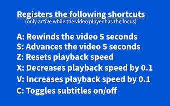 تقدم الإضافة مجموعة من الاختصارات التي تعزز سهولة الاستخدام، بما في ذلك خيارات لتبديل الترجمة، بالإضافة إلى ضبط سرعات التشغيل بدقة. يمكن للمستخدمين إعادة الفيديو لمدة 5 ثوانٍ باستخدام مفتاح 'A'، والتقدم بنفس المقدار باستخدام 'S'، وضبط سرعة التشغيل بشكل تدريجي باستخدام 'X' و 'V'. القدرة على إعادة ضبط سرعة التشغيل إلى الوضع الطبيعي باستخدام 'Z' تضيف مزيدًا من المرونة، مما يجعل هذه الأداة إضافة قيمة لطلاب كورتسيرا.